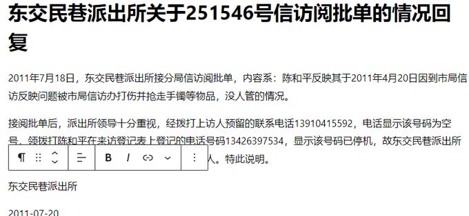 2011年7月18日,东交民巷派出所接分局信访阅批单,内容系:陈和平反映其于2011年4月20日因到市局信访反映问题被市局信访办打伤并抢走手镯等物品,没人管的情况。