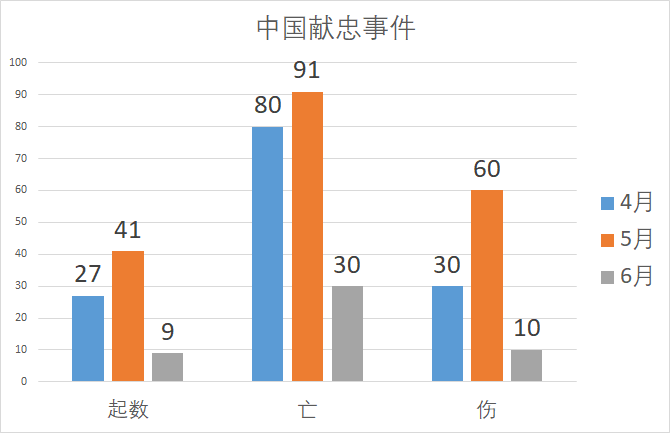 据不完全统计,2023年6月中国献忠事件,至少9起,造成30人以上死亡,10人以上受伤。