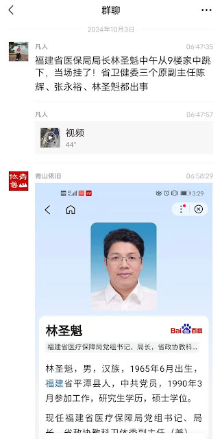 2024年10月2日中午,福建省医保局局长林圣魁中午从9楼家中跳下,当场死亡,传言贪污疫情防控经费26.08亿元用于行贿习近平