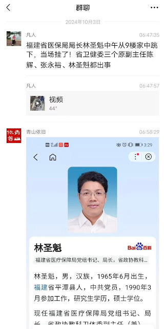 大家好,网上传出消息称,2024年10月2日中午,林圣魁从9楼家中一跃而下,当场死亡。至此,福建省卫健委三个原副主任陈辉、张永裕、林圣魁都已出事。传言林圣魁贪污疫情防控经费26.08亿元用于行贿习近平。