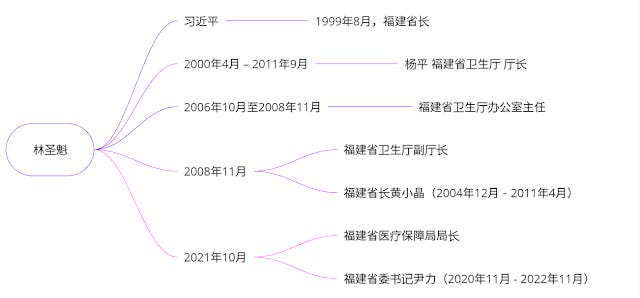 2008年11月,林圣魁被提拔为福建省卫生厅副厅长。当时的福建省长是黄小晶(2004年12月-2011年4月)。黄小晶是和习近平一起在三坊七巷打炮的炮友。黄小晶是福州副书记杨布提拔的,杨布的小儿子杨建新,是邓颖超的秘书。而习近平的老豆习仲勋是邓颖超老公周恩来长达10年的大秘。