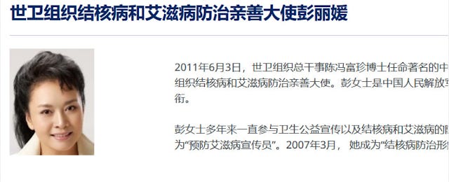 2011年6月3日,在卫生部副部长尹力的运作下,彭丽媛被聘任为世卫组织结核病和艾滋病防治亲善大使
