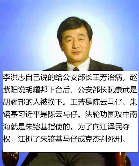 李洪志自己说的给公安部长王芳治病。赵紫阳说胡耀邦下台后,公安部长阮崇武因为是胡耀邦的人被陈云换下。王芳接替阮崇武担任公安部长,王芳是陈云马仔。朱镕基习近平是陈云马仔。法轮功围攻中南海就是朱镕基指使的。为了向江泽民夺权,江泽民抓了朱镕基马仔成克杰判死刑。选在了法轮功围攻中南海一周年纪念日4月25日。