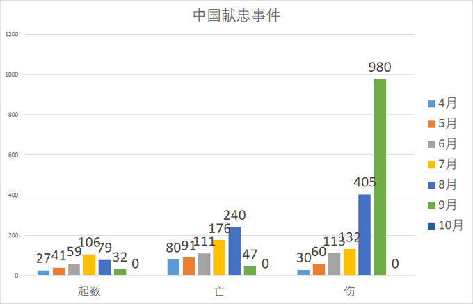 据不完全统计,2023年9月中国献忠事件,至少32起,造成47人以上死亡,980人以上受伤。