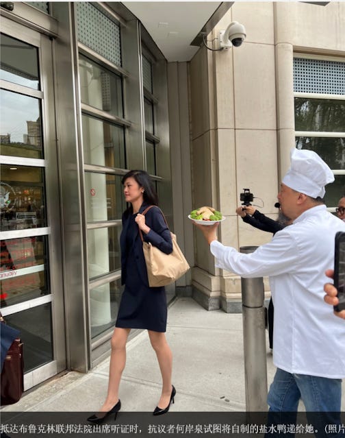 2024年9月25日,被控非法充当中共代理人的孙雯抵达布鲁克林联邦法院出席听证时,抗议者何岸泉试图将自制的盐水鸭递给她。我要向何岸泉这样的行为表达敬意。因为在美国和平的抗议,完全是合理合法的。在美国如果真不敢抗议中共,那在中国更不可能了。何岸泉这种抗议,伤害性不强。起码在力所能及的范围之内,表达了对中共的抗议,讽刺。